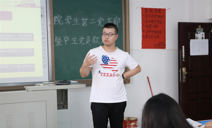 学生第三党支部书记廖书海老师表示,首先对新加入的同志表示热烈祝贺,大学能加入党组织是一个莫大的荣幸。作为一名党员同志,要牢记党员一面旗帜的作用,不要入党后就开始松散,大家都要发挥先锋模范作用,做的越来越好。同时也要积极的向党组织汇报自己的情况,让党组织能更加全面的了解我们党员同志。
