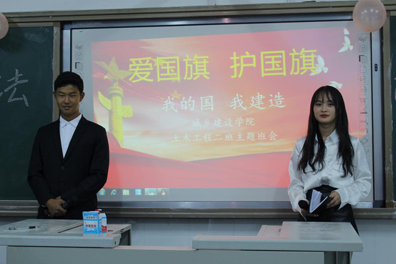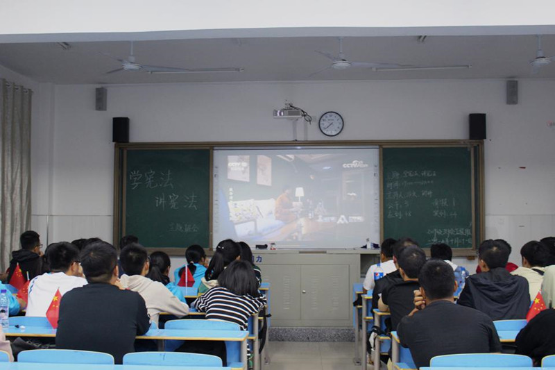 在各班主持人的主持下,班会活动正式开始。为了加深学生对宪法掌握情况,更好地普及宪法知识,各班的班长及团支书对宪法的相关文本进行诵读和“爱国旗,护国旗”有关国旗法的宣传。随后同学们观看普及宪法视频,视频中所体现的宪法知识与同学们的生活密切相关,强调了权利与义务的统一性。通过观看视频内容,不仅增强了同学们的法律意识,而且极大地调动了他们学习宪法的积极性。