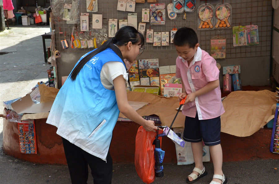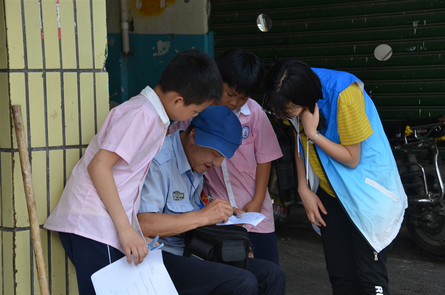 课堂教学环节后,志愿者们带着小朋友们来到东塔公园开展课外活动。课外活动环节包括问卷调查和捡垃圾。在捡垃圾的过程中,志愿者与小朋友们共同协作,小朋友们之间胜负欲分外强烈,一个争着一个地将周围的垃圾捡完。
