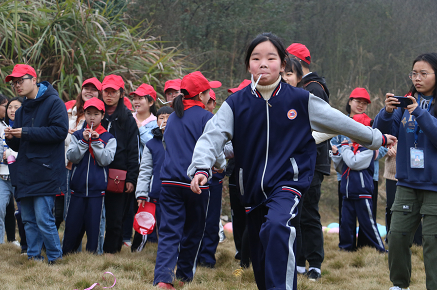 早上雾气朦胧,志愿者与唐四完小留守儿童在明德楼前集合排组,并分发帽子和必需用品。在开场仪式结束后,一行人走上大巴车,开赴云溪谷开始今天的活动。在车上,志愿者们细心叮嘱她们应该注意的安全事项,车到达指定场地,各组领取了相应的树苗和种植工具。种植过程中,志愿者们帮助孩子们挥舞锄头并讲解关于红叶石楠的小知识,孩子们好奇得侧耳倾听大哥哥大姐姐的描述,又小心翼翼将树根的泥土踩实,用稚嫩的双手在新翻的土地撒上清水。低头看看小脚上黏住的厚厚泥土,脸上的笑容更加灿烂了。孩子们和志愿者共同在小树的姓名牌上写上专属寄语,愿家乡绿意葱茏,越来越美好。最后,志愿者携手孩子们在草坪上开展游戏活动,恰逢天公作美,天气忽然转晴,这样的天气和那一张张灿烂的笑容使人倍感春意的暖意和生机。