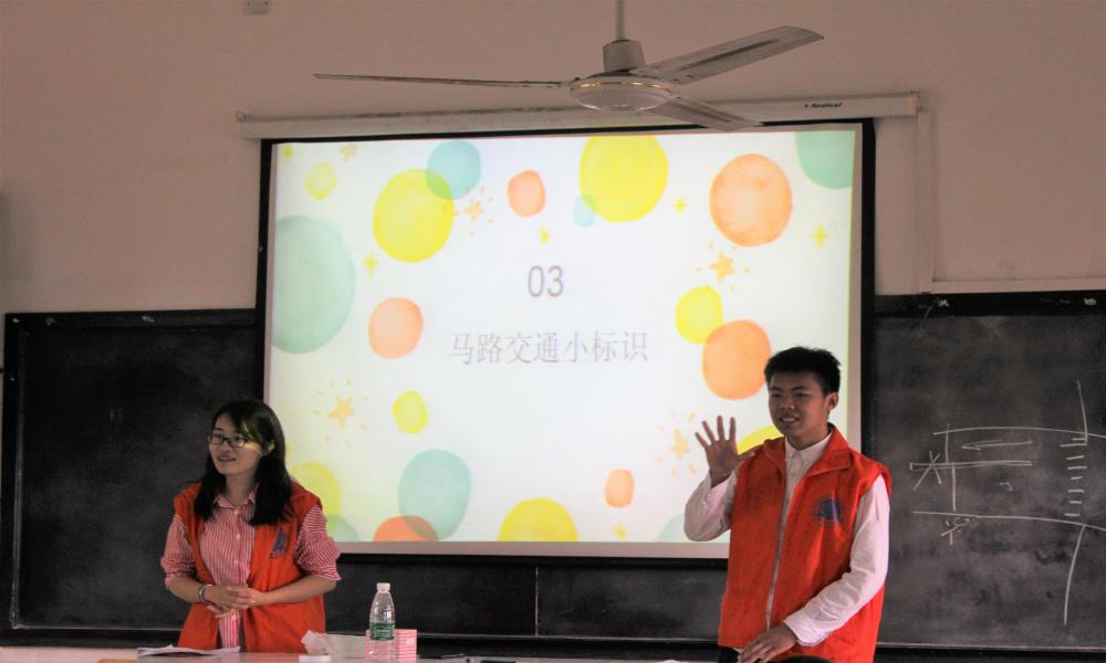 紧接着,志愿者根据此次活动的主题为孩子们展开了一系列特色课堂——交通法规课、食品安全课、爱国教育课和民族文化课。其中,为了让孩子们能够懂得交通法律法规保护自身安全,来自城乡建设学院2017级城乡规划班的陈伟鹏和康君颖准备了一堂主题为“安全时时不忘,平安处处相伴”的交通法规课。他们用一段公益动画成功吸引孩子们的注意,并以PPT播放的形式教孩子们认识常见的交通路标、遇到突发的交通状况处理的方法。在课堂最后,志愿者老师设置了模拟情景剧,孩子们在实践中快速掌握了知识。