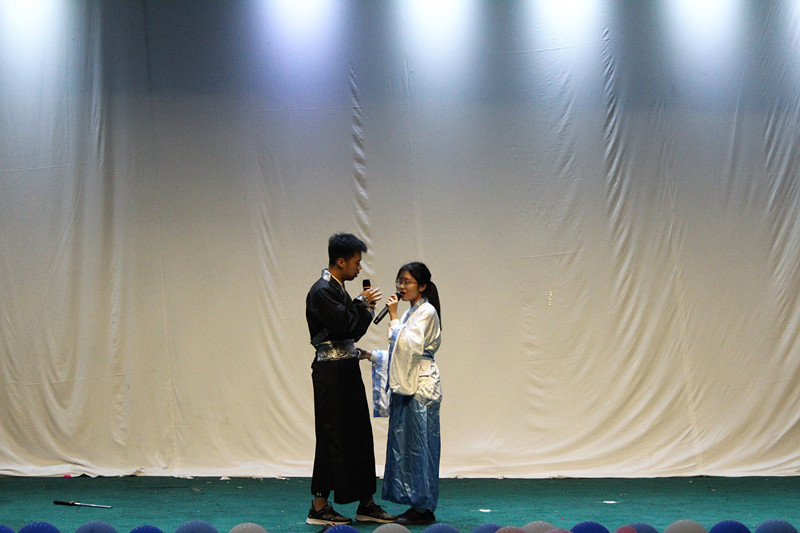 一曲优美轻缓的英文歌,拉开了本次晚会的序幕。第一轮“声临其境”的比拼中,参赛选手们仿佛都成了专业配音演员,用流利的英语为影视节目配音,绘声绘色地还原了剧情,博得台下观众阵阵喝彩。班级才艺展更是将活动推向了高潮,各班成员之间配合默契,幽默诙谐的人物表演,精彩搞笑的英语台词,精彩纷呈。土木一班的情景剧《灰姑娘》主角辛德瑞拉的扮演者表演得惟妙惟肖,形象地演出了受欺负后摇身一变的灰姑娘。此次活动在“争分夺秒”游戏中进入尾声,竞争激烈,考察了同学们对英语歌曲的了解程度。