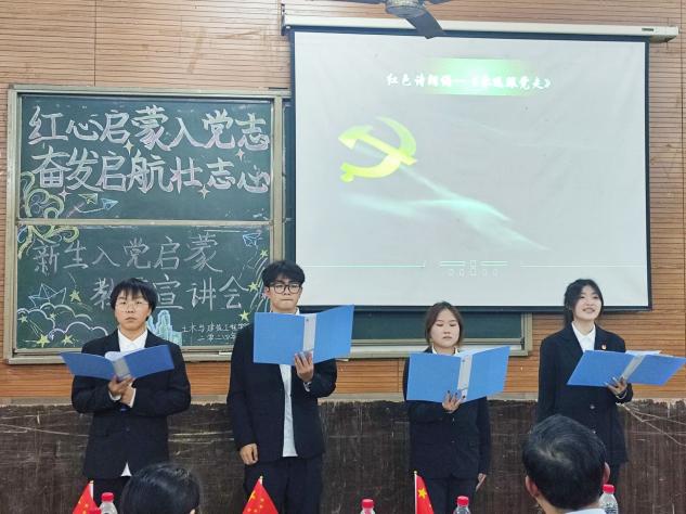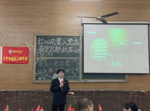 2024年11月3日,邵阳学院土木与建筑工程学院在邵阳学院梅子井济世楼107教室举行以“红心启蒙入党志,奋发启航壮志心”为主题的新生入党启蒙教育宣讲会。学院党总支书记黄雄伟、组织员曾艳、学生第一党支部书记唐后乐、学生第一党支部副书记李耀龙、学生第二党支部副书记黄颜璐、学生第二党支部宣传委员张婷、团总支副书记胡可歌出席本次会议。