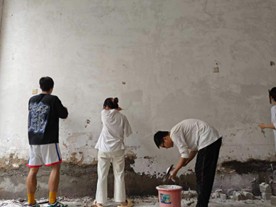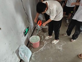 下午2:30,同学们在求真楼一楼集合,指导老师为同学们讲述施工流程并提醒学生严格遵守安全规定,确保自身安全。在简单的讲解后,同学们开始做基层的处理,总体流程为刮掉墙灰、打磨腻子粉、将腻子刮到墙上,腻子完全干透之后,再仔细地打磨平整。在实习过程中,同学们紧密协作、相互配合,认真观察施工细节和现场情况,与团队成员一起讨论技术问题、制定施工方案、协调资源分配,共同解决施工难题,确保实习工程的顺利进行。整套流程下来,墙面的状态平整光滑、纹理均匀。