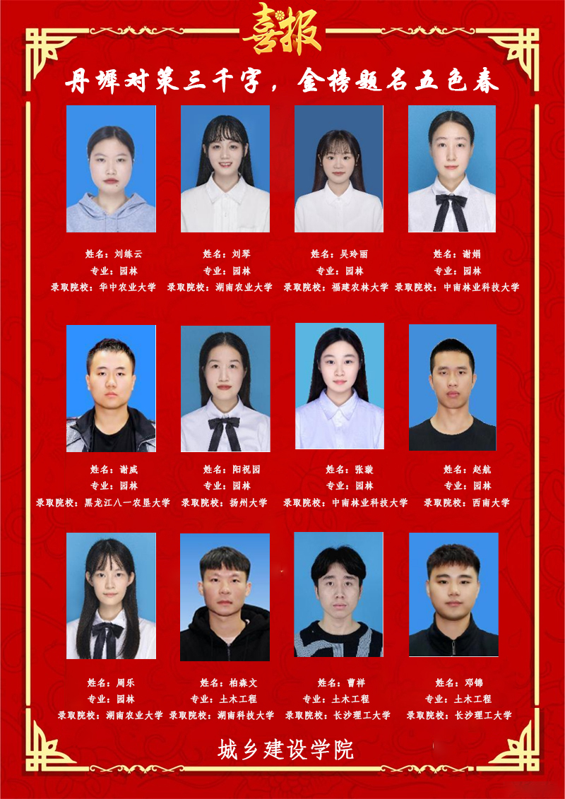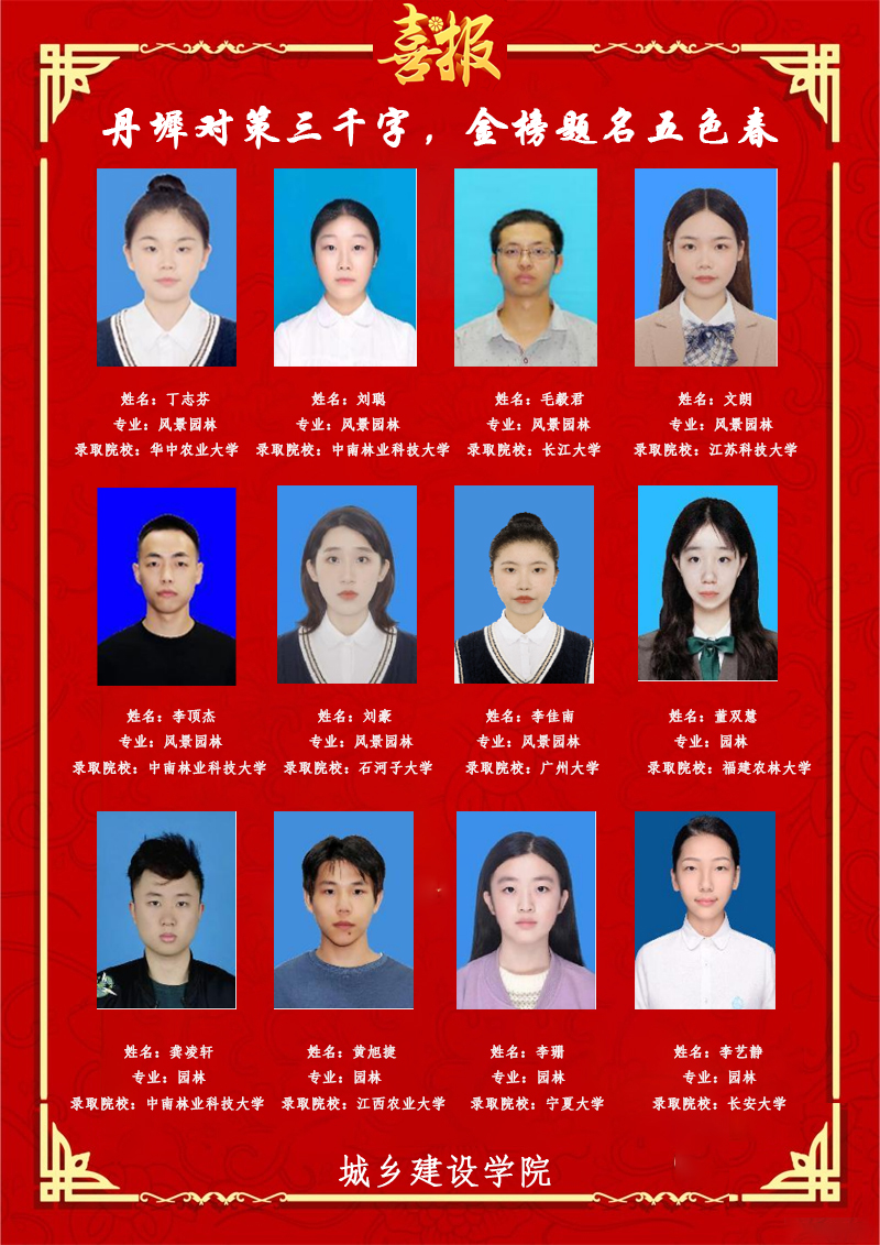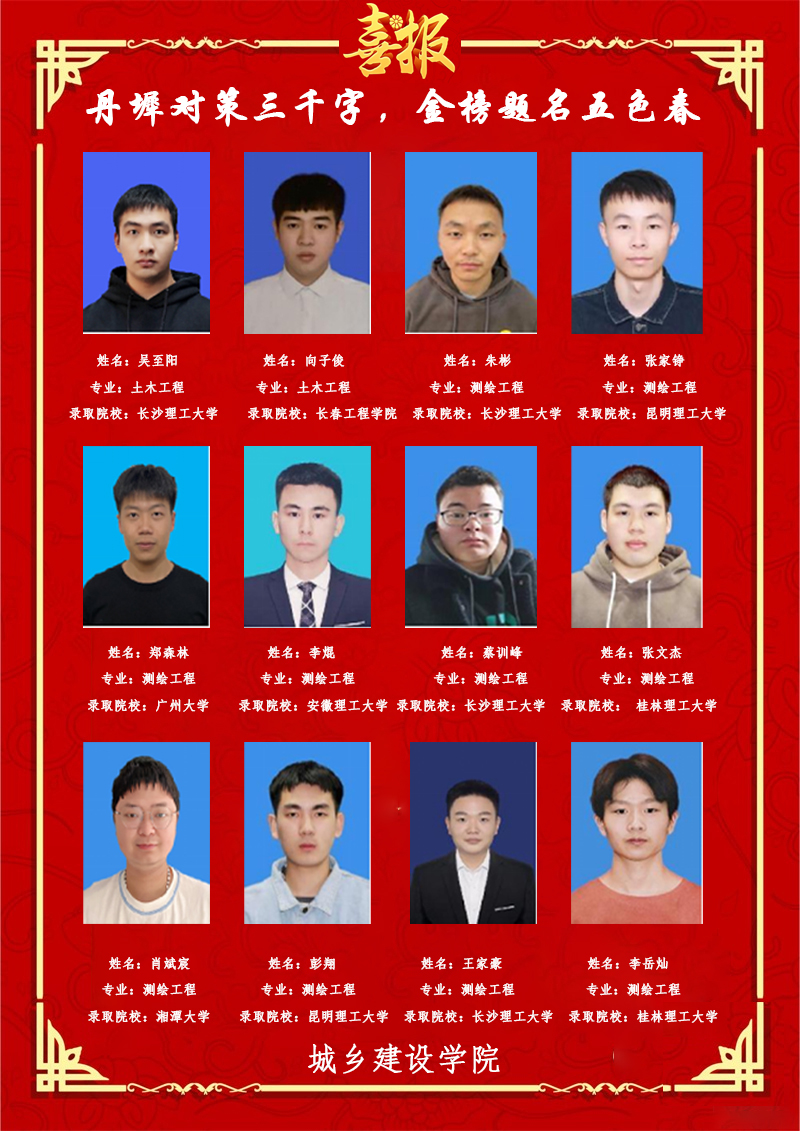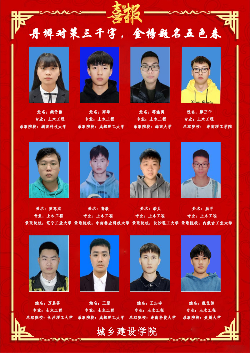 艰难方显勇毅,磨砺使得玉成。2022年,在学校党委、行政的坚强领导下,通过全院师生的共同努力,城乡建设学院考研再创佳绩,2022届毕业生401人,56人被录取为硕士研究生,升学率为13.96%。其中土木工程专业14栋522宿舍4名同学全部被录取,创造邵阳学院工科男生考研录取的新纪录。2017级风景园林专业丁志芬、2017级城乡规划专业夏俊雄、2018级园林专业赵航等同学以优异的成绩分别被华中农业大学、北京工业大学、西南大学等双一流高校录取。