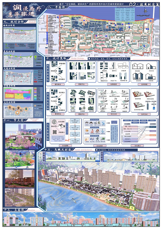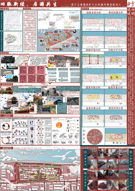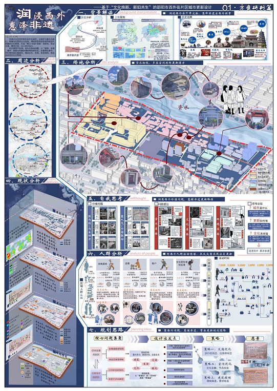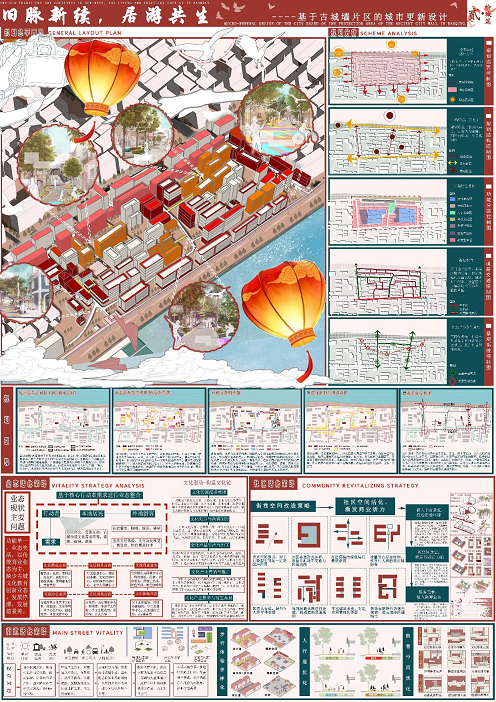 本次大赛由各参赛队伍通过校级选拔赛和省级初赛,产生了入围名单。通过激烈的评选,我校共6组入围,18名同学获奖。此项大赛以 “在地生长的积极场所”为核心主题,聚焦建筑与土地、与土地上人的紧密关系,除了注重地域文化方面的认同,也在绿色建筑和社区共享空间方面也提出了更多要求。我校城乡规划专业学生作品融合了空间规划、生态修复与地域文化,其中《旧脉新续,居游共生——城市微更新设计》、《润浸西外,惠泽非遗》参赛作品获得省级二等奖,另外4组队伍获得三等奖。参赛作品展现了学生对可持续发展理念的深刻理解,不少方案具备实际应用价值,既有城市老旧小区绿色升级设计,也有可持续建设理念的与地域文化元素深度结合。