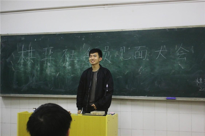 会议伊始,由社团干事汪洋全同学致开场词,他简短的介绍社团历史和社团日常活动,他对棋弈社成员说:“方圆尺地之间,汉界楚河惊浪。黑白相持方寸中,无烟争战守和攻。我们以棋会友,乐在棋中,棋逢一场真英雄,可敢与君会棋中。”
