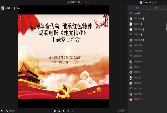 为了弘扬党的革命传统,继承党的伟大精神,城乡建设学院学生第四党支部于2020年6月28日晚上7点以线上会议的方式召开了以“弘扬革命传统,继承红色精神”为主题的党日活动。城乡建设学院学生第四党支部书记曾艳、副书记林芳、组织委员吕沅蔓、纪检委员张念及全体支部成员出席了本次活动。