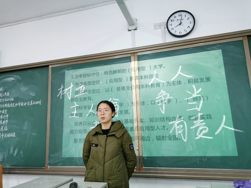 接下来在才艺表演环节中,19级地理科学二班张乐倩带来的二胡独奏《赛马》将骏马飞驰的动感美展现地淋漓尽致,更让在坐的同学们仿佛身临其境、尽情领略了草原的美丽。班会接近尾声,团支书最后概括总结了审核评估的要求并反复强调了主人翁意识对个人发展的重要性。