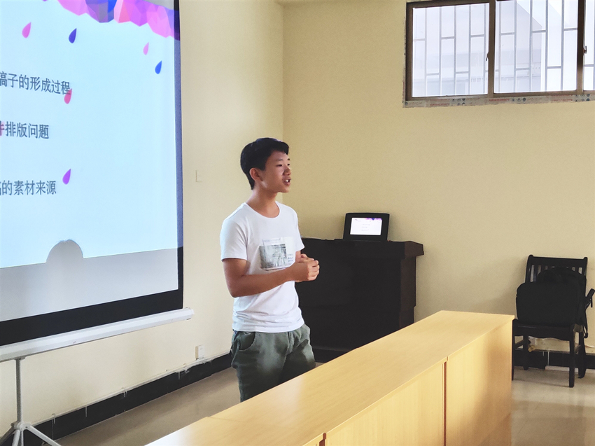 9月25日采编部从微信稿、新闻稿写作、稿件排版、格式要求等方面进行详细讲解,并通过对过往佳作的分析让干事掌握不同稿件的写作技巧26日,运营部稿子在各类平台的排版修改进行详细教学编辑器将文稿与图片进行穿插,最后发布到网上形成最终的作品27日,影像部培训了基础相机握法和拍照技巧让干事体验按下快门的感觉加强理论知识的记忆。其中强调了图片结构与色彩的重要性,不同主题的色彩基调不同给人别样的感受最后一天的行政培训中,详细规定了通知的格式讲解了电子海报以及手绘海报的制作流程。