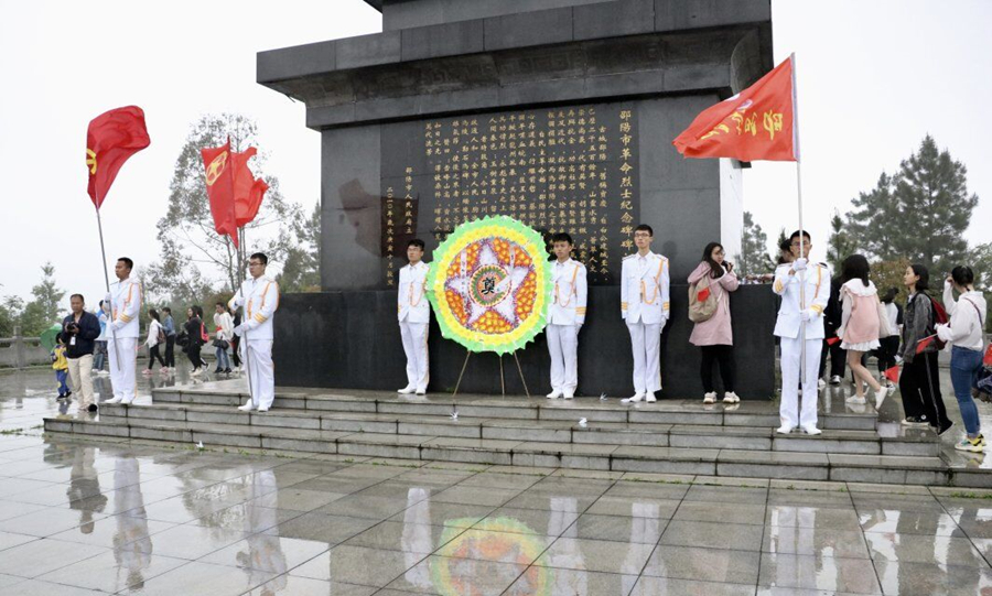 早上九点十分,位于蔡锷将军铜像前,活动正式开始。邵阳学院校团委书记唐跃同志为同学们讲述蔡锷将军一生历程。此后,由城乡建设学院音漫舞台主持团带来朗诵《五月的畅想》,他们用慷慨激昂的语调表达对英雄的敬畏和思念。敬献完花篮,全体成员重新体验长征,踩着泥泞的山路,高唱着邵阳学院校歌以及革命歌曲,歌声在山林间飘荡向远方。集合至革命英雄纪念广场时,全体成员共同聆听松坡公园园长讲述英雄们的故事,接着抗战老兵杨明庄爷爷与城乡建设学院团总支书记廖述海同志共同给邵院青年们讲述一堂生动的微团课。随后,优秀团员代表在团旗下进行演讲,带大家一起重温入团誓词。活动最后,在场的领导、老师以及学生迈着沉重的步伐,按序来到革命英雄纪念碑前默哀并献上菊花和纸鹤,瞻仰革命烈士碑,追思先烈士伟迹。