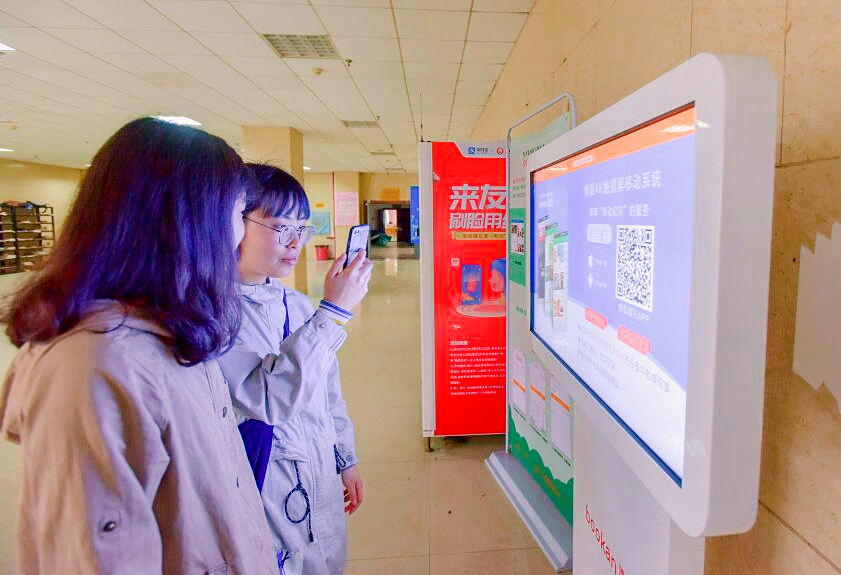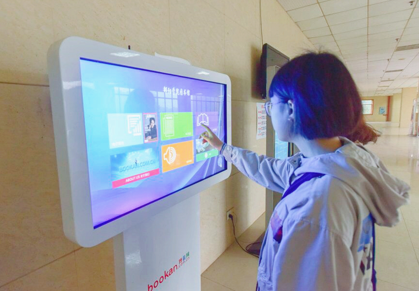 4月23日世界读书日,邵阳学院的同学们在图书馆博看书苑触摸屏前认真学习搜索阅读期刊、图书资料的使用方法