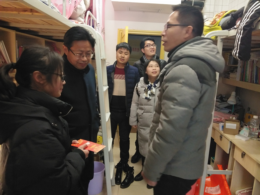 党总支书记张友柏、党总支副书记刘桂江一行人来到学生宿舍,与困难学生亲切交流,关心学生的考试情况及寒假去向,叮嘱学生注意返乡安全,如有什么困难可以及时向老师反馈,鼓励学生努力学习,考取理想成绩。最后,向学生表达了新年的祝福与期望,送上慰问金以资鼓励。