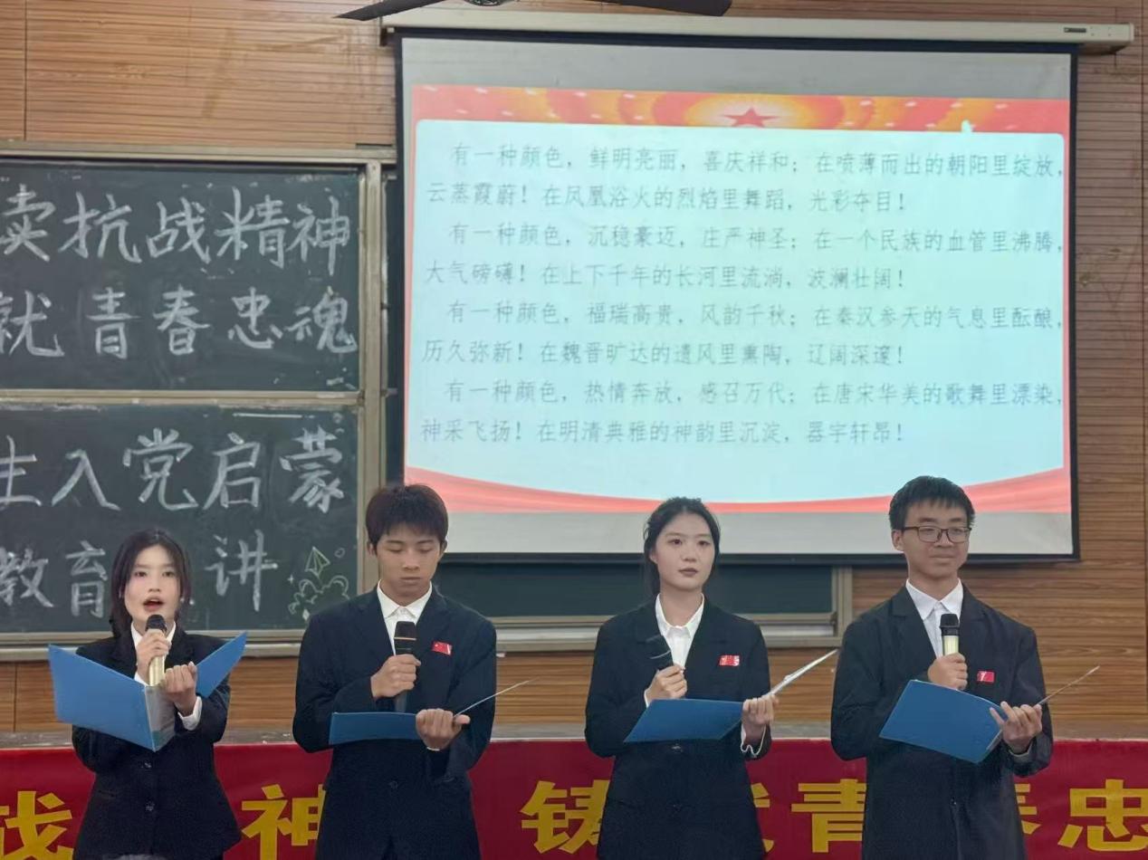 第二党支部的唐心怡、裴婕妤、胡彦聪、雷宇峰表演了诗歌朗诵节目——《中国红》,歌颂伟大祖国。他们用激昂顿挫的语调、真挚饱满的情感,将“中国红”背后的历史记忆与精神力量娓娓道来,时而深情婉转,时而慷慨激昂,台下新生无不屏息聆听,眼中满是对祖国的崇敬与自豪,现场氛围被推向小高潮。