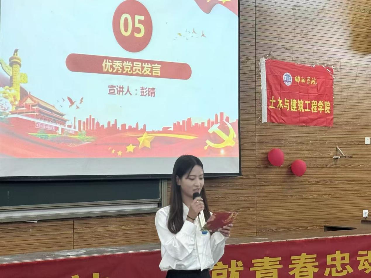 学生第一党支部优秀党员彭晴热情地分享自己的经历感受,并寄语在座同学们,要以自信自立的精神风貌勇担时代重任,将个人理想追求融入国家发展大局,在强国建设、民族复兴的伟大征程中实现个人成长与祖国发展的同频共振,用青春力量书写无愧于时代的精彩答卷。