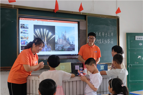 支教第一天,邵阳学院赴大祥区雨溪镇童梦启航关爱留守儿童服务团的成员用别出心裁的方式教唐四完小的孩子们如何进行垃圾分类。