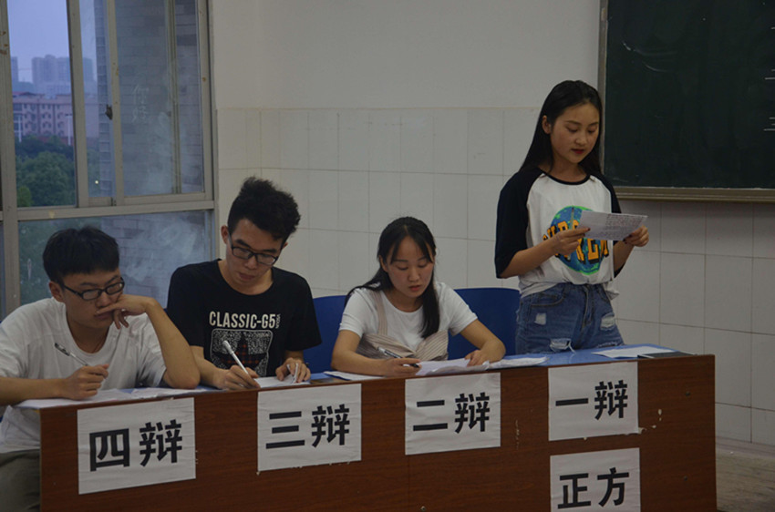 比赛开始于当日下午19时整,比赛开始前各班参赛选手以及评委嘉宾齐聚明德楼北栋教室,大家在做了简单的自我介绍后,比赛正式开始,双方选手在辩论中思路清晰、争锋相对,都纷纷就己方的辩题提出自己独到的见解,场面一度变得紧张而激烈,各班辩手在驳辩时也是一针见血,使现场气氛迅速升温。各队正反方都不甘示弱,台下观众也是激情澎湃,掌声不断。在选手的唇枪舌战中,比赛一次又一次被推向了高潮。