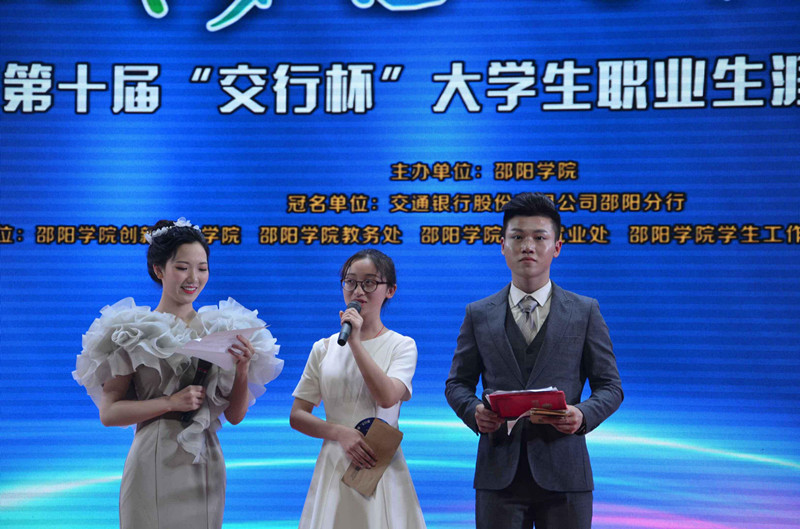 为帮助同学们树立正确的人生观、职业观, 科学合理规划大学生活4月25日-26日晚,由邵阳学院主办的第十届“交行杯”大学生职业生涯规划大赛总决在图书馆报告厅成功行。邵阳学院副校长曾阳素、党委委员副校长袁曦、党委委员副校长王刚、党委委员副校长向文江、交通银行邵阳分行副行长李杰和邵阳分行营业部副行长肖腊松作为嘉宾出席此次大赛。