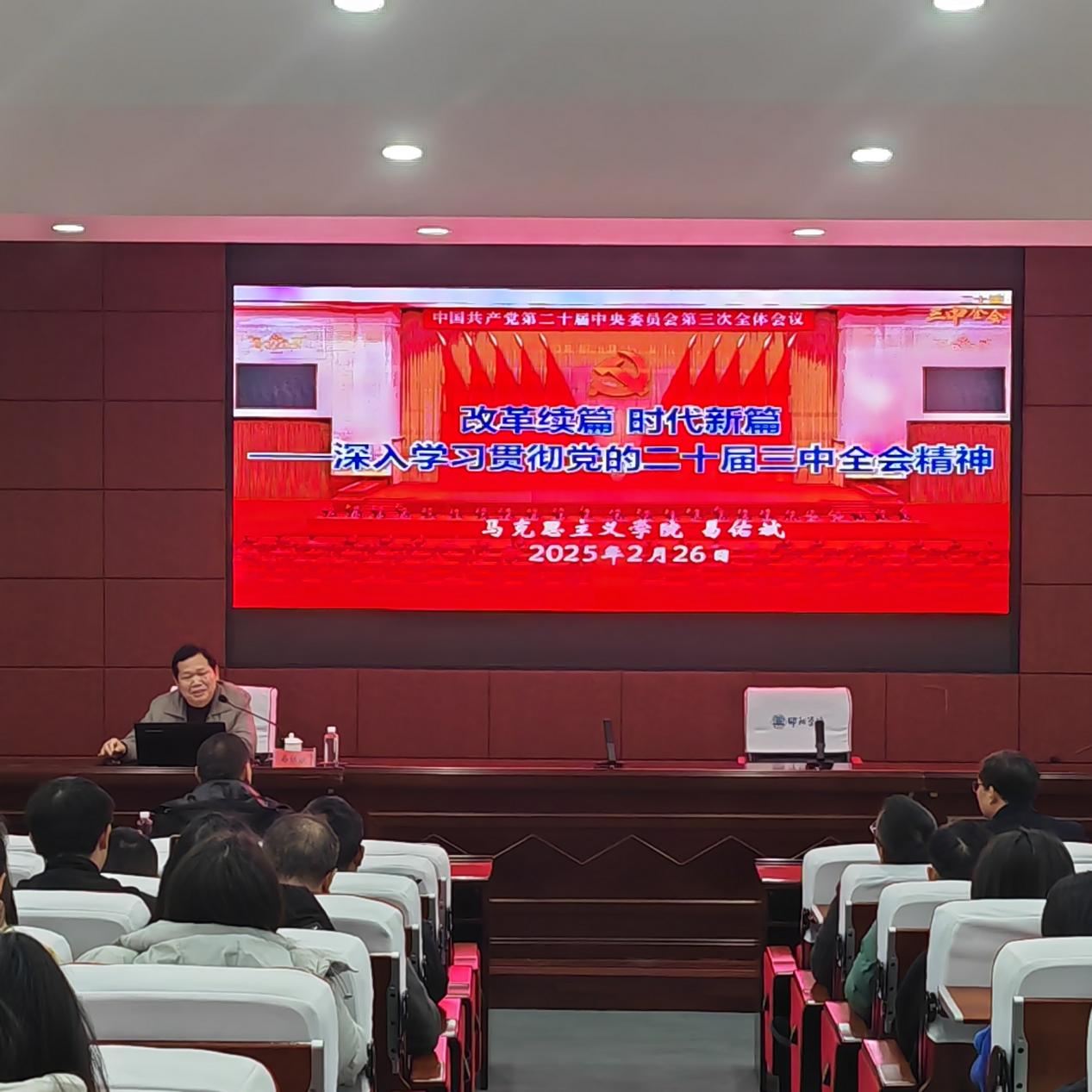 为深入学习贯彻党的二十届三中全会精神,凝聚奋进力量,2025年2月26日下午,邵阳学院土木与建筑工程学院联合设计艺术学院组织师生在邵阳学院润德楼报告厅开展专题学习讲座。本次讲座特邀邵阳学院马克思主义学院党总支书记易佑斌为我们全面讲述党的二十届三中全会精神。