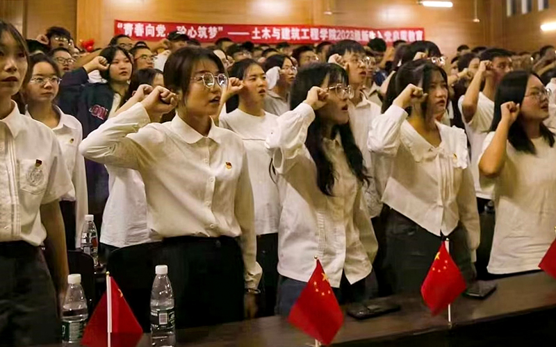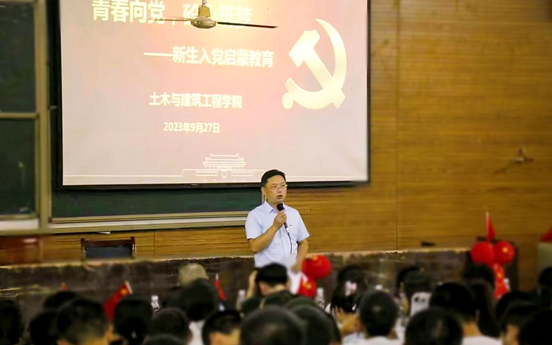 习近平总书记强调:入队、入团、入党,是青年追求政治进步的“人生三部曲”。为引导2023级新生坚定理想信念和政治信仰、用实际行动积极向党组织靠拢,土木与建筑工程学院于9月27日晚上在梅子井校区第二实训楼107教室举办“青春向党,砼心筑梦”新生入党启蒙教育活动。土木与建筑工程学院党总支书记黄雄伟、学生党支部书记唐后乐和刘珍媛、组织员曾艳、2023级辅导员伍荣伟、全体2023级新生参与活动。