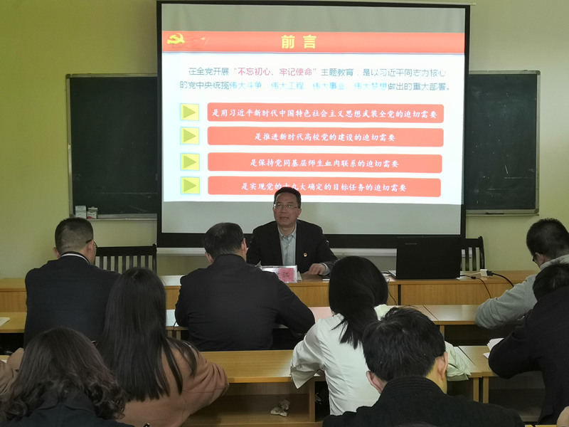 向文江教授首先传达了全党上下开展“不忘初心、牢记使命”主题教育的重大意义、总体要求、根本任务和具体目标。他强调,要守初心、担使命、找差距、抓落实,通过一系列主题教育使广大党员同志更加坚定对马克思主义的信仰、对中国特色社会主义的信念,传承红色基因,铭记党的奋斗历程,弘扬党的优良传统。
